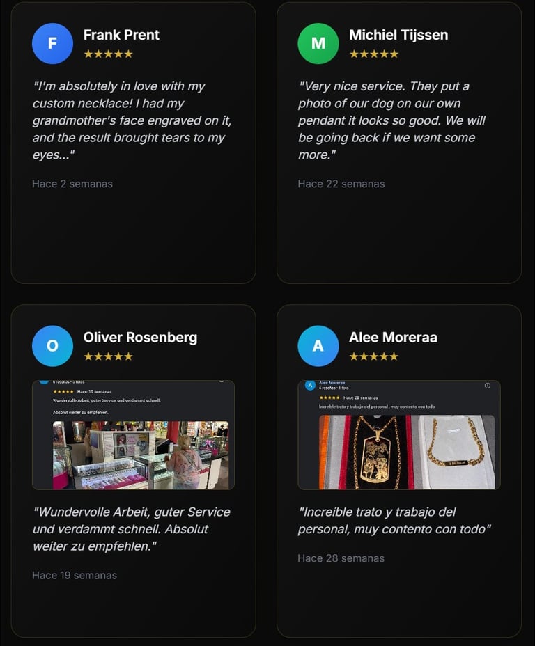 Foto Grabados en Joyas, con un legado forjado a lo largo de tres generaciones de maestros grabadores, presenta una propuesta de colaboración para elevar la experiencia en centros comerciales de lujo. Unimos el arte atemporal del grabado tradicional con tecnología de vanguardia y una técnica artística propia para transformar recuerdos y emociones en piezas únicas de belleza perdurable y calidad inquebrantable.